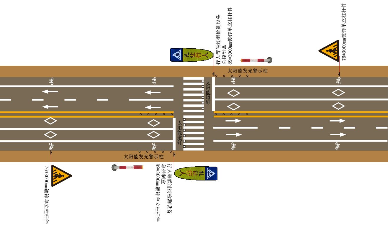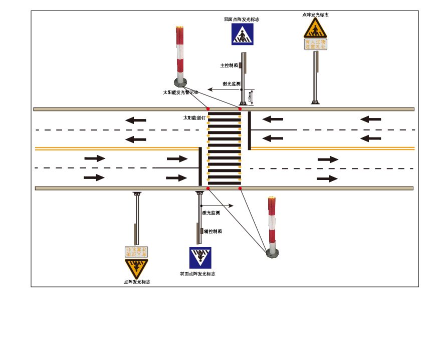本解決方案所涉安全設(shè)施包括:主動發(fā)光注意行人標(biāo)志、太陽能發(fā)光警示柱、太陽能道釘、主動發(fā)光“禮讓行人”標(biāo)志、行人過街檢測感應(yīng)設(shè)備、數(shù)據(jù)傳輸接受設(shè)備等。