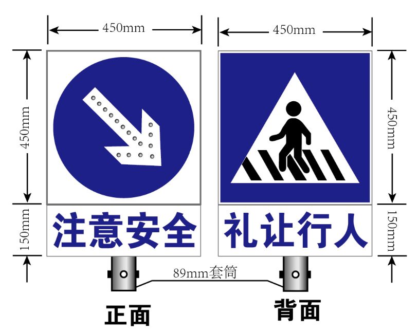 在交通安全工程中,為了讓某區(qū)域根據(jù)不同的車流方向設(shè)置不同的路權(quán),需要在入口顯眼處設(shè)定雙面標(biāo)志牌,方便不同方向的車流觀察、確認(rèn),如中央隔離帶缺口處,設(shè)置雙面太陽能標(biāo)志牌,一面為“允許掉頭”,另一面為“禁止掉頭”,用于區(qū)分來、去車輛的掉頭權(quán)利。當(dāng)然,也存在這樣的雙面太陽能標(biāo)志牌,正面為主標(biāo)志信息版面,背面為“謹(jǐn)慎駕駛、注意安全”等交通安全宣傳標(biāo)語。