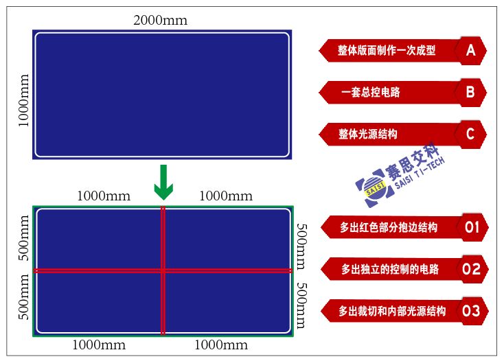 單塊標志的報價,不同的版面尺寸、版面內(nèi)容,對標志的報價也會有一點的影響。1、版面尺寸。(1)版面尺寸在:1平米至15平米之間,按正常平方單價報價(**元/平米);(2)版面尺寸大于15平米時,因大版面需要加內(nèi)部特殊加固結(jié)構(gòu),故其平方單價要比正常尺寸略高;通常會加50元/平米;(3)尺寸小于1平米時,小型標志需要多追加抱邊結(jié)構(gòu)、控制電路、人工損耗等(如下圖:1塊1米*2米的標志,和4塊0.5米*1米相比較,雖面積相等,但造價成本卻有差異,顯然用同樣的平方單價計算就不合理。),故其通常按單套報價(**元/套),若折算為平方單價,通常會乘以1.2—1.3的系數(shù)。