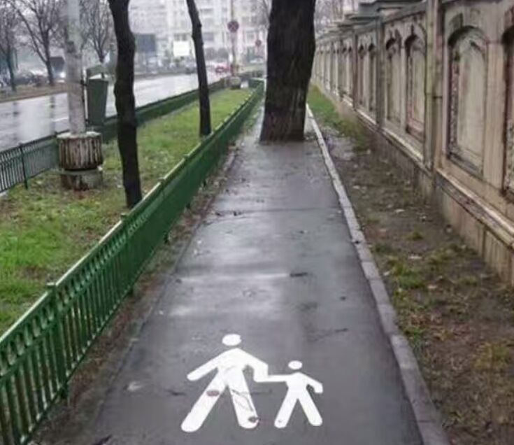 地面標線其實反映了一個悲壯的事故,——“走,我們一起去撞樹!”,——“不!”,——“別怕,我拉著你!”。老樹很委屈:“當我是一棵樹苗的時候,這里還是一片荒野!我一直就在這里,從未離開!怎么就占了你們人類的路?!”