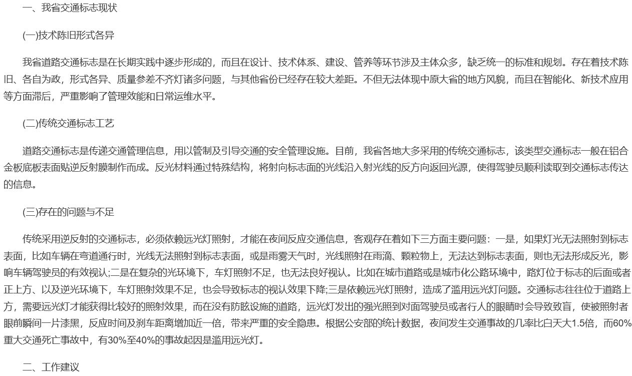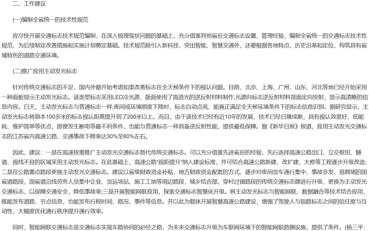 主動(dòng)發(fā)光標(biāo)志,因其具備獨(dú)特的功能優(yōu)勢(shì),主要有:(1)能主動(dòng)發(fā)光,不需依賴汽車遠(yuǎn)光燈照射;(2)提升標(biāo)志的遠(yuǎn)距離視認(rèn)性;(3)增強(qiáng)標(biāo)志的易捕捉性和警示性;(4)增強(qiáng)標(biāo)志在雨、霧、冰、雪、霾、逆光等惡劣交通環(huán)境中,仍能保持良好的顯示效果。上述功能能彌補(bǔ)在特殊交通環(huán)境中普通逆反射標(biāo)志的功能不足現(xiàn)象。為此,文中還給出相關(guān)建議:“一是在高速按需推廣主動(dòng)發(fā)光交通標(biāo)志替代傳統(tǒng)交通標(biāo)志??梢猿浞纸梃b先進(jìn)省份的經(jīng)驗(yàn),先行選擇高速公路出口、立交樞紐、隧道、視線不良的區(qū)域采用主動(dòng)發(fā)光標(biāo)志。在此基礎(chǔ)上,高速公路“視距提升”納入建設(shè)標(biāo)準(zhǔn),并可結(jié)合高速公路新建、改擴(kuò)建、大修等工程逐步升級(jí)改造;二是在公路重點(diǎn)路段更換主動(dòng)發(fā)光交通標(biāo)志。建議以省級(jí)財(cái)政資金補(bǔ)貼,地方財(cái)政資金配套的方式,逐步對(duì)夜間貨車通行集中、事故多發(fā)、易擁堵的國(guó)省道路段,國(guó)省道沿線勞務(wù)人員集中企業(yè)、貨運(yùn)場(chǎng)站、施工工地等周邊路段,城鄉(xiāng)結(jié)合部、穿村過(guò)鎮(zhèn)路段的傳統(tǒng)交通標(biāo)志牌進(jìn)行升級(jí),更換為主動(dòng)發(fā)光交通標(biāo)志,以保障交通安全,降低事故率;三是開(kāi)展智能網(wǎng)聯(lián)應(yīng)用,探索交通標(biāo)志智慧化升級(jí)。將主動(dòng)發(fā)光標(biāo)志與智能網(wǎng)聯(lián)、數(shù)據(jù)融合等技術(shù)結(jié)合應(yīng)用,既能發(fā)布道路、節(jié)點(diǎn)信息,也能發(fā)布行程時(shí)間、路況、事件等信息。并以此為載體開(kāi)展智慧高速公路建設(shè),增強(qiáng)了駕駛?cè)伺c指路標(biāo)志之間的信任度與互動(dòng)性,大幅度優(yōu)化通行秩序提升通行效率。”