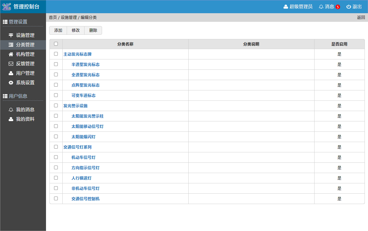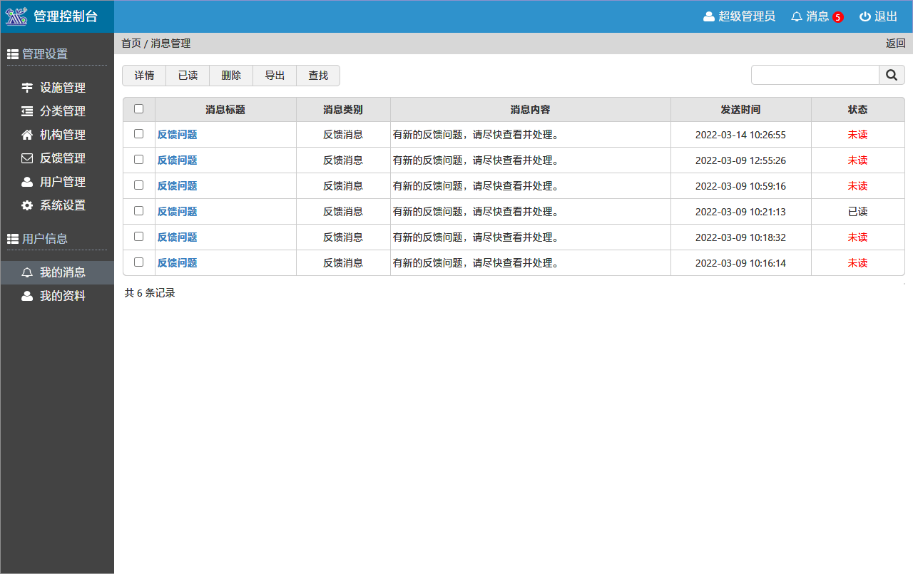 設(shè)施管理系統(tǒng)擁有完善的后臺(tái)管理功能,可按列表添加設(shè)施設(shè)備,可按層級(jí)添加分類、機(jī)構(gòu)??梢蕴砑佣鄠€(gè)管理用戶,并設(shè)置不同管理權(quán)限。當(dāng)收到反饋信息后,能及時(shí)顯示新消息數(shù)量。在反饋管理模塊中,可查看當(dāng)前反饋的信息列表,及時(shí)處理對(duì)應(yīng)問(wèn)題。