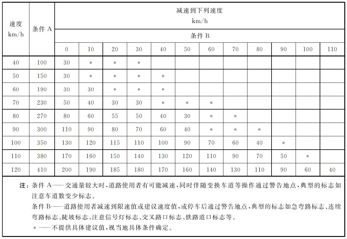 交通事故管理區(qū)標(biāo)志采用專用的熒光粉紅色為底板,區(qū)別于常見的藍(lán)、黃、綠色為底色,讓標(biāo)志從視覺上更具沖擊力,司機(jī)在很遠(yuǎn)處看到粉紅色標(biāo)志,也許字樣還未看清,但已明白前方區(qū)域肯定與事故管控有關(guān)。本標(biāo)志用于警告前方路段正在進(jìn)行道路交通事故管理,車輛駕駛員應(yīng)減速慢行、停車等候或繞道行駛,應(yīng)根據(jù)道路限速情況,設(shè)置于事故發(fā)生區(qū)域前方的適當(dāng)位置,前置距離一般值,參考如下列表。