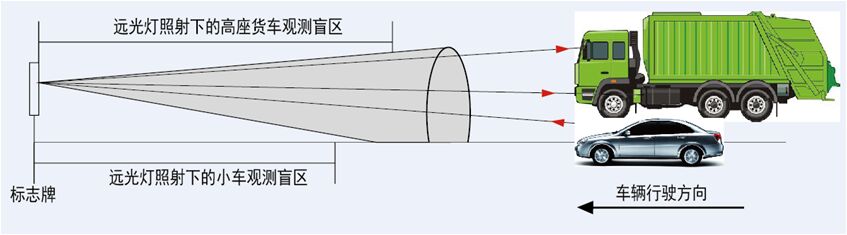 “明明開了遠光燈,卻只能看到路邊標志的下半部分,上面的,根本不反光!”司機小張皮膚黝黑,前年剛貸款買了一輛大貨車從事貨運業(yè)務(wù),向我抱怨道?!耙婚_始,我以為是標志老了,但經(jīng)常出現(xiàn)這種情況,我就覺得肯定有問題!我以前開小轎車時,還沒有遇到這種情況!”我記住他的問題,開始查閱相關(guān)資料,原來是這樣的:“普通標志在遠光燈照射下,由于光的衍射性能,在反射時會形成光錐,并形成核心亮,外圍暗的特征,即車燈所照射的標志中央,其反光最清晰,而其邊緣就明顯發(fā)暗,甚至根本不反光。大型高座車輛駕駛?cè)说囊暰€始終接近反射光錐的邊緣,其觀察到的標志反光性能要明顯低于小轎車駕駛?cè)藛T”,如下圖所示: