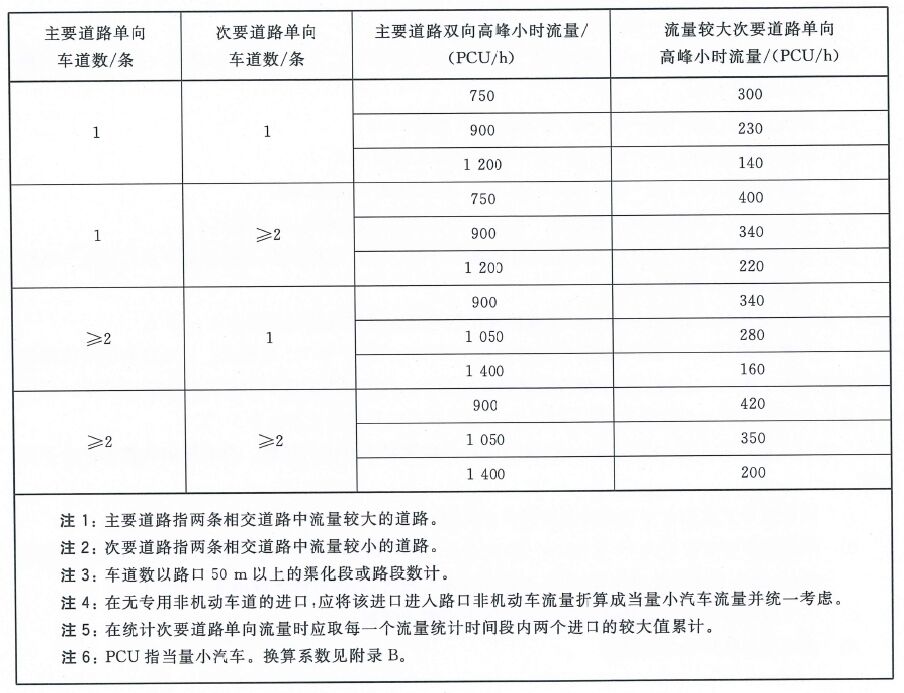 I、條件一:路口機(jī)動(dòng)車高峰小時(shí)流量超過(guò)下表所列數(shù)值時(shí);