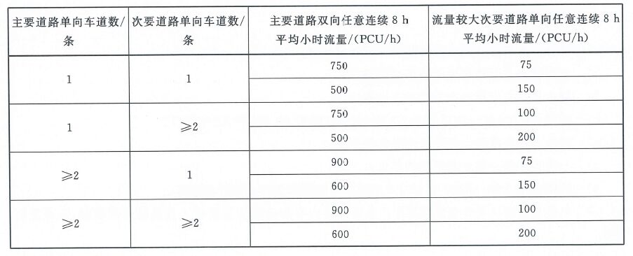 II、條件二:路口任意8小時(shí)的機(jī)動(dòng)車平均小時(shí)流量超過(guò)下表數(shù)值時(shí)。