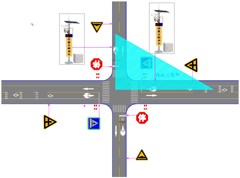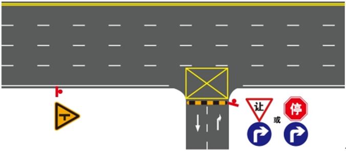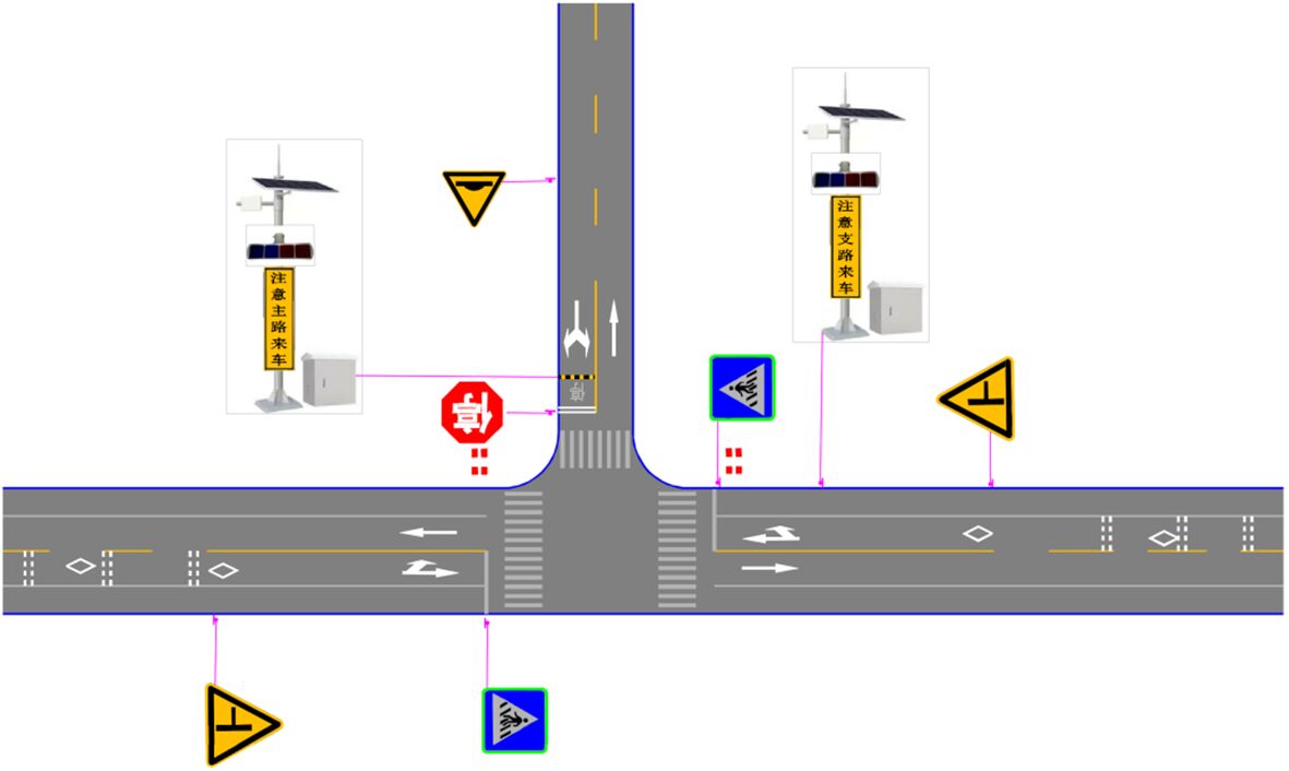 A)支線上設(shè)置減速讓行、或停車讓行標(biāo)志,有條件可采用太陽(yáng)能主動(dòng)發(fā)光標(biāo)志,或于標(biāo)志上方配置太陽(yáng)能爆閃警示燈。