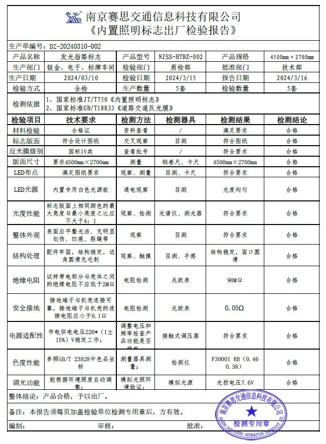 (10)文件材料檢查。最后,我們?cè)诎l(fā)光標(biāo)志產(chǎn)品批量打包,準(zhǔn)備發(fā)貨前,還需檢查所供貨品的文件資料是否齊備,主要包括:《出廠檢測(cè)報(bào)告》、《合格證書》、《安裝說(shuō)明書》、《交貨清單表》、《公安部檢測(cè)報(bào)告》等,為方便客戶向業(yè)主交貨,提供必要的交貨資料。