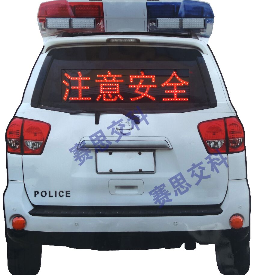 2、基本說明:標(biāo)志面層為仿真等比例警車車尾UV噴繪圖案,面層采用鋁質(zhì)板材,標(biāo)志圖案、字樣輪廓嵌入紅色高倍LED發(fā)光管,上置紅、藍(lán)暴閃燈,下方左右各置全紅剎車燈,中間“車窗”設(shè)置發(fā)光警示標(biāo)語,整體結(jié)構(gòu)合理,用材精致。