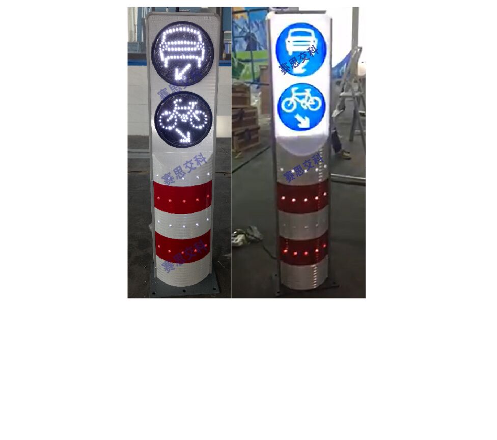 2、基本說明:采用一體式柱體結構,標志版面圖案中嵌入LED發(fā)光管,柱體上設置警示發(fā)光管,采用太陽能蓄電池供電,設置于中央隔離帶端口。