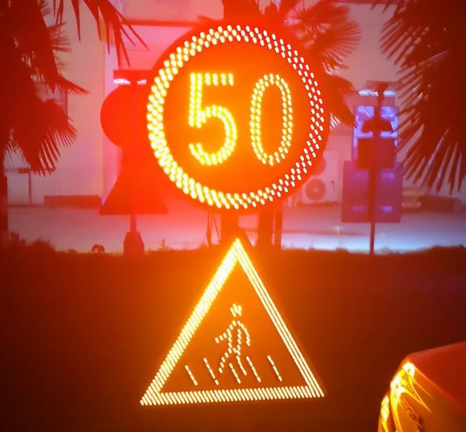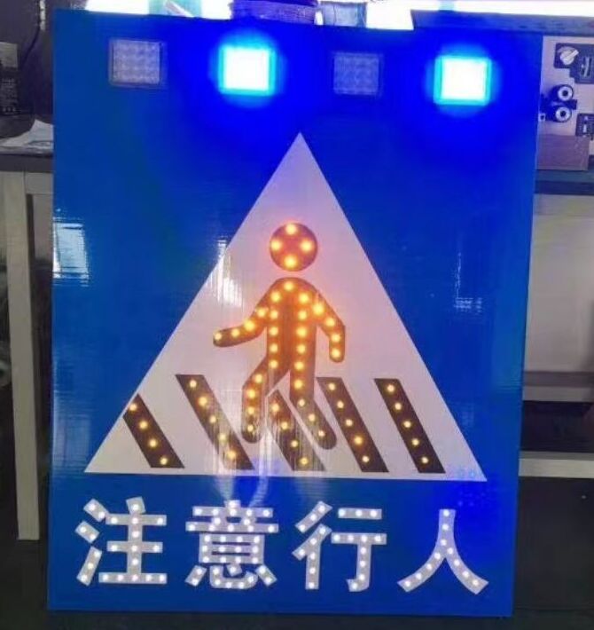 “外置LED點(diǎn)陣”工藝,所應(yīng)用的LED發(fā)光管具備極強(qiáng)的光穿透性,特別是在陰雨、霧霾等道路能見(jiàn)度低的交通場(chǎng)景中,其優(yōu)點(diǎn)在于表現(xiàn)關(guān)鍵圖案的警示效果,再應(yīng)用頻閃的發(fā)光模式,根據(jù)遠(yuǎn)距離警示效果,尤其適用于提示道路危險(xiǎn)源的警示標(biāo)志,和傳達(dá)管理指令的禁令標(biāo)志等。但其不足之處在于:顯示文字、字符、小圖案等沒(méi)有“內(nèi)置LED投射”工藝那么飽滿、平整。所以,為追求最佳視覺(jué)效果,通常會(huì)根據(jù)同一塊版面中的不同內(nèi)容,選擇最佳的工藝表現(xiàn)方式,如:可變車(chē)道標(biāo)志、潮汐車(chē)道標(biāo)志,我們會(huì)采用這樣的工藝方式處理,邊緣線采用的半投射工藝,箭頭采用“外置LED點(diǎn)陣”工藝。如:帶有輔標(biāo)的禁令標(biāo)志,禁令圖標(biāo)部分采用“外置LED點(diǎn)陣”工藝,輔標(biāo)部分采用“內(nèi)置LED投射”的全投射工藝。