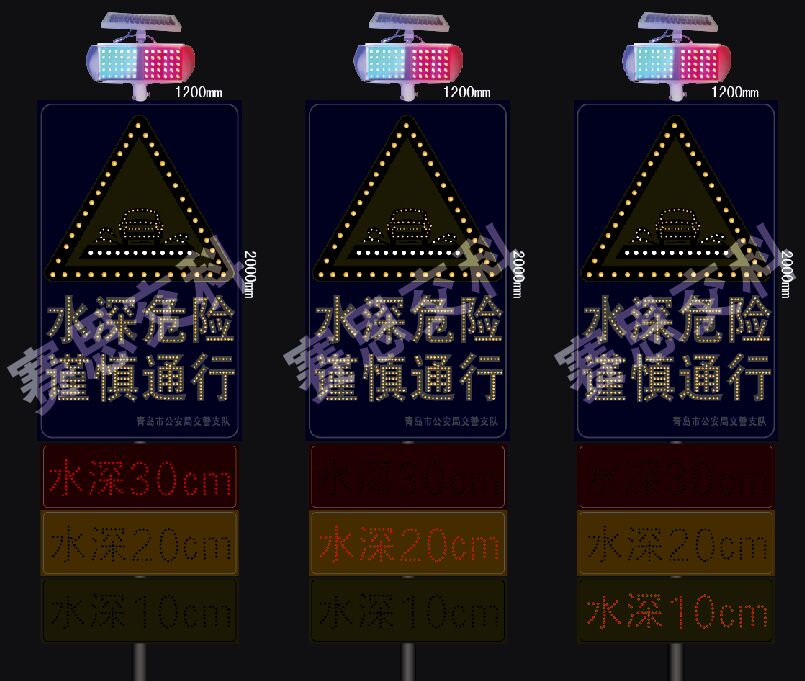 在積水區(qū)域提前設(shè)置告知標(biāo)志,讓路段駕駛?cè)藛T能提前改道繞行,減輕擁堵壓力,規(guī)避深水行車危險隱患。如下圖所示智能型主動發(fā)光標(biāo)志。
