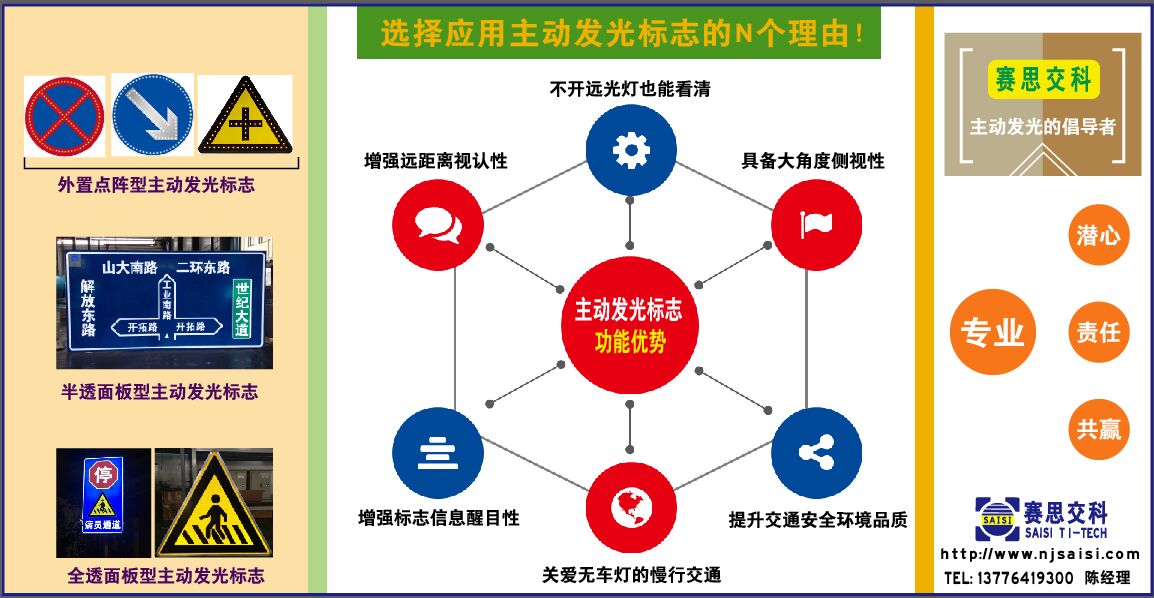 南京賽思交通信息科技有限公司,是一家專業(yè)從事交通安全研究、創(chuàng)新型交安設(shè)施研發(fā)的科技型公司,我公司研發(fā)、生產(chǎn)、銷售的主動(dòng)發(fā)光標(biāo)志系列產(chǎn)品,已在全國各地的交通安全工程中廣泛使用,并在交通穩(wěn)靜化的提示、警示、管理方面取得了良好的功能效果,更多了解交通安全技術(shù)方案、創(chuàng)新交通安全產(chǎn)品,可登錄本網(wǎng)站m.4yfotyk.cn查閱,或致電:陳經(jīng)理,13776419300。
