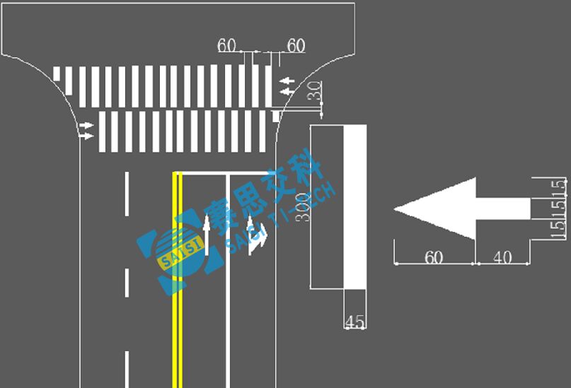 為提高人行橫道的通行秩序與效率,在具備可施劃6m寬度人行橫道線的條件下,可采用導(dǎo)向式人行橫道線施劃方式,線寬為45cm,兩段線長(zhǎng)都為3m,兩段線間隔30cm,實(shí)空對(duì)稱交錯(cuò)施劃,在人行橫道線的兩端按照靠右通行的習(xí)慣添加導(dǎo)向箭頭,具體尺寸如下圖所示。